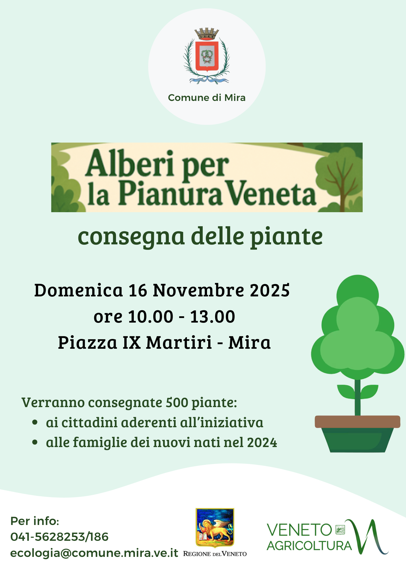 E' prevista per domenica 16 Novembre 2025 dalle ore 10.00 alle ore 13.00 presso la Piazza IX Martiri di Mira la consegna delle piante ai cittadini che hanno aderito all'iniziativa Alberi in Pianura; verranno inoltre consegnate le piantine alle famiglie dei bambini nati nel 2024, residenti nel territorio comunale.