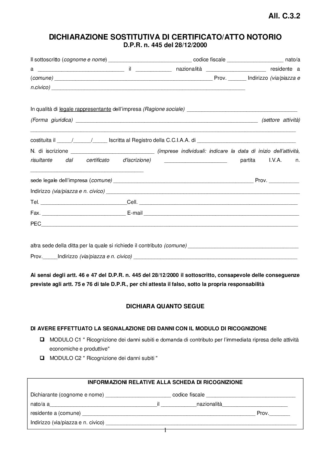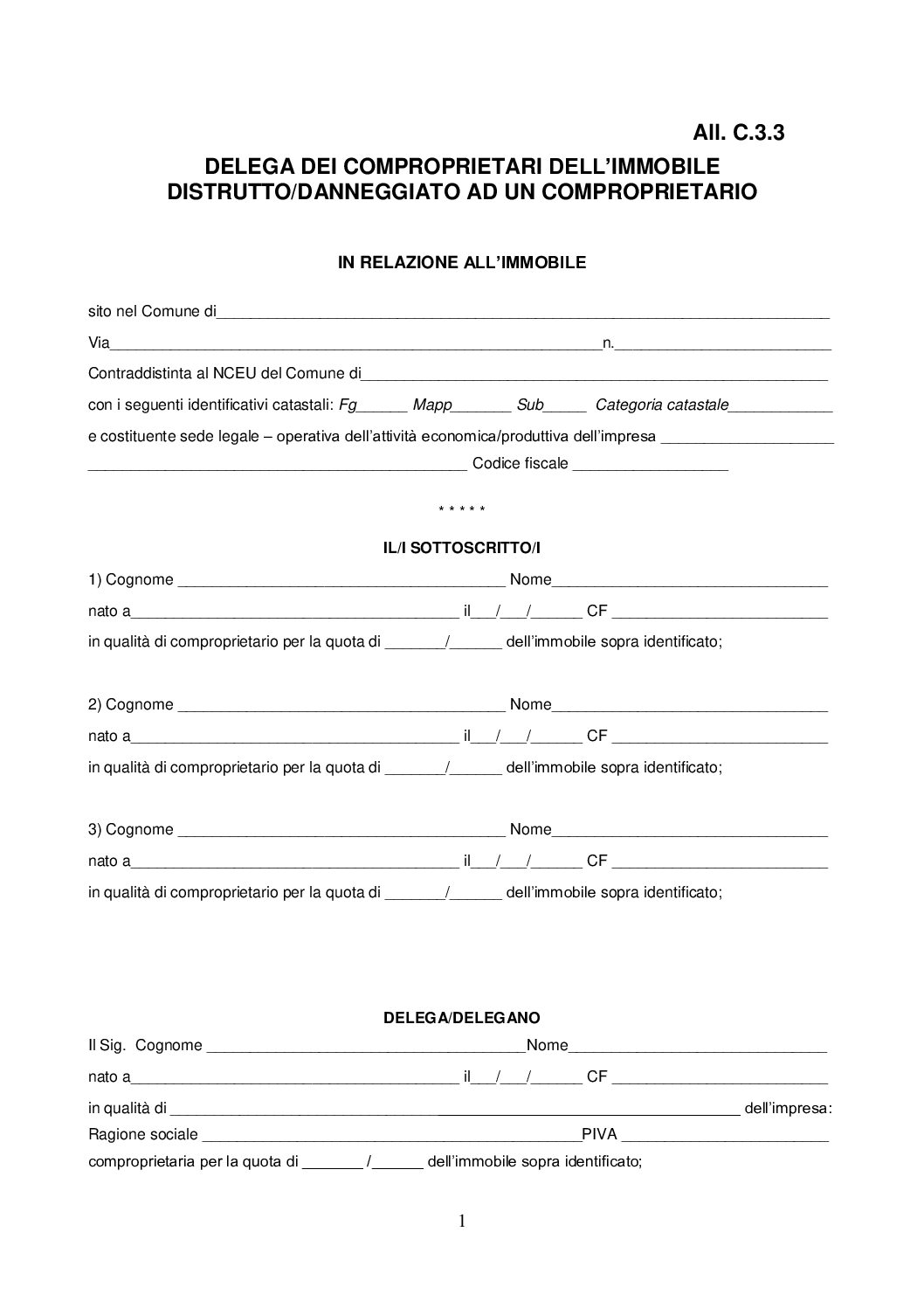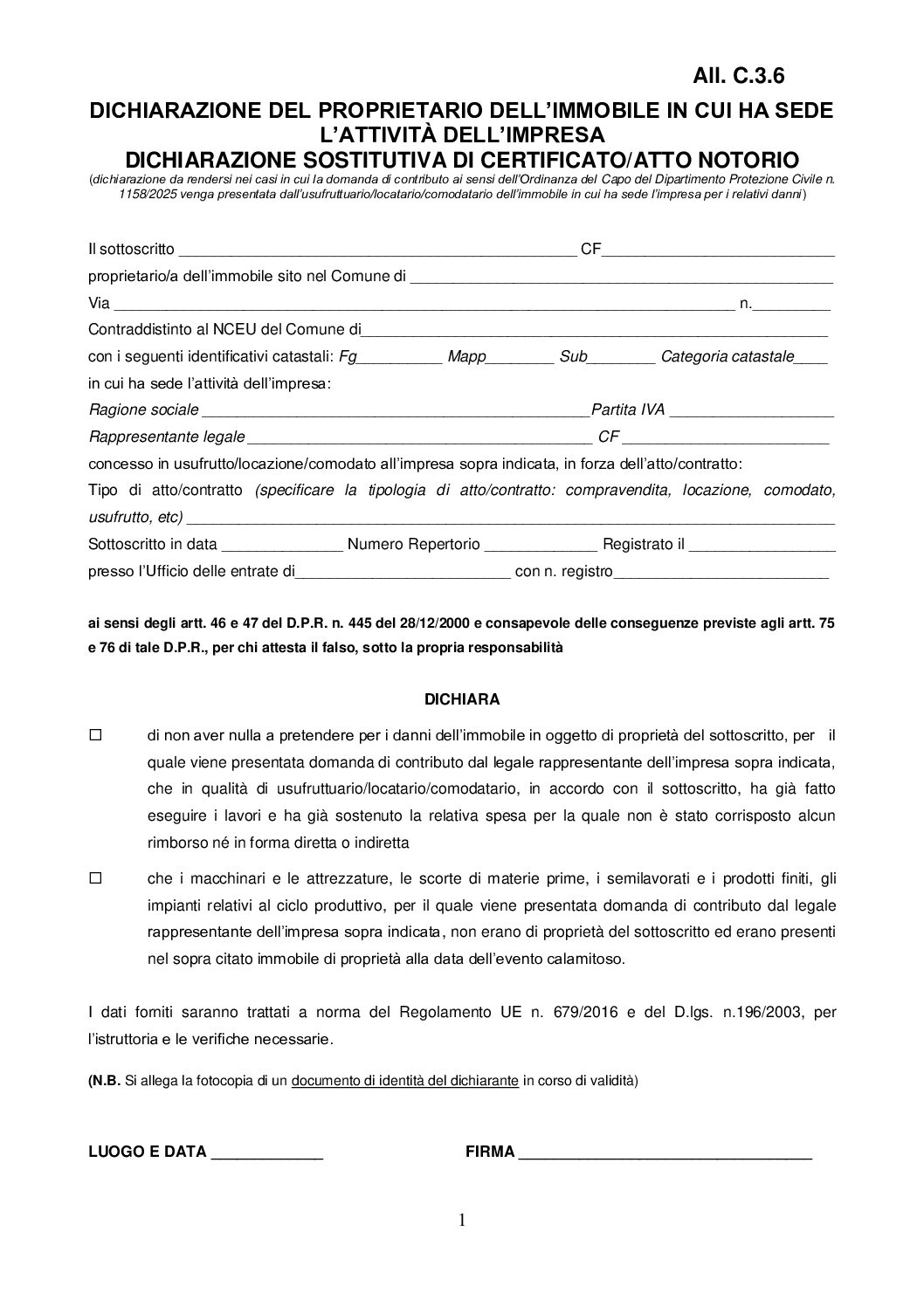 Documentazione da presentare e criteri: I soggetti interessati potranno presentare al Comune l’apposita domanda di contributo (Allegato C.3.1), utilizzando la modulistica prevista dall’OCDPC n. 1158/2025, corredata dalla perizia asseverata redatta da un tecnico abilitato (Allegato C.3.4) e dalla dichiarazione sostitutiva (Allegato DSAN mod. A / DSAN mod. B). In caso di immobili in comproprietà andrà presentata anche la delega dei comproprietari (Allegato C.3.3).