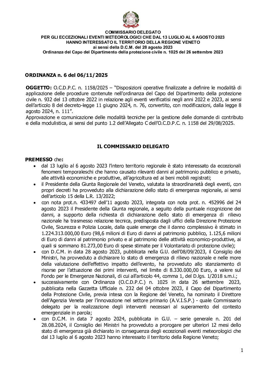 A seguito della pubblicazione in Gazzetta Ufficiale dell’Ordinanza del Capo Dipartimento di Protezione Civile n. 1158 del 29/08/2025, con Ordinanza Commissariale n. 6 del 06/11/2025 è stata approvata la modulistica per lo svolgimento delle attività finalizzate alle misure di cui alla lett. e) dell’art. 25 c. 2, del D. Lgs. n. 1/2018, per i contributi a favore delle attività economiche e produttive coinvolte dagli eventi atmosferici occorsi nei giorni dal 13 luglio al 6 agosto 2023 nel territorio della Regione del Veneto.
