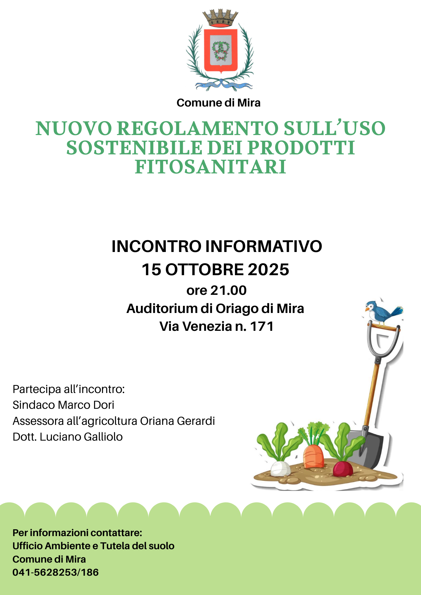 Il 15 Ottobre 2025 alle ore 21.00 presso l'Auditorium di Oriago si terrà l'incontro relativo alla presentazione del nuovo regolamento sull'uso sostenibile dei prodotti fitosanitari. L'incontro è rivolto a tutta la cittadinanza.