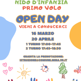 In occasione dell'apertura dei termini per la presentazione delle domande di ammissione all'asilo nido comunale di Mira Primo Volo che potranno essere presentate nel periodo che va dal 15/03/2026 al 30/04/2026 le famiglie interessate a visitare la struttura potranno farlo nei seguenti giorni e orari: