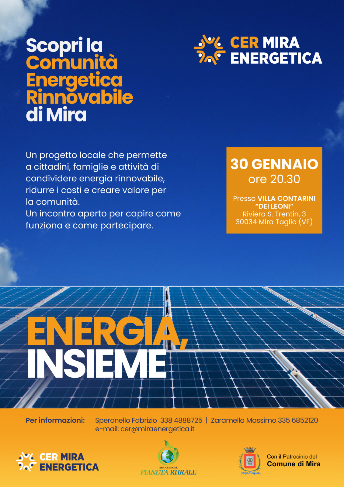 La Comunità energetica "CER MIRA ENERGETICA", in collaborazione con l'associazione Pianeta Rurale e con il patrocinio del Comune di Mira, invita la cittadinanza all'incontro dal tema "Energia, Insieme" venerdì 30 gennaio alle ore 20.30 in Villa dei Leoni.