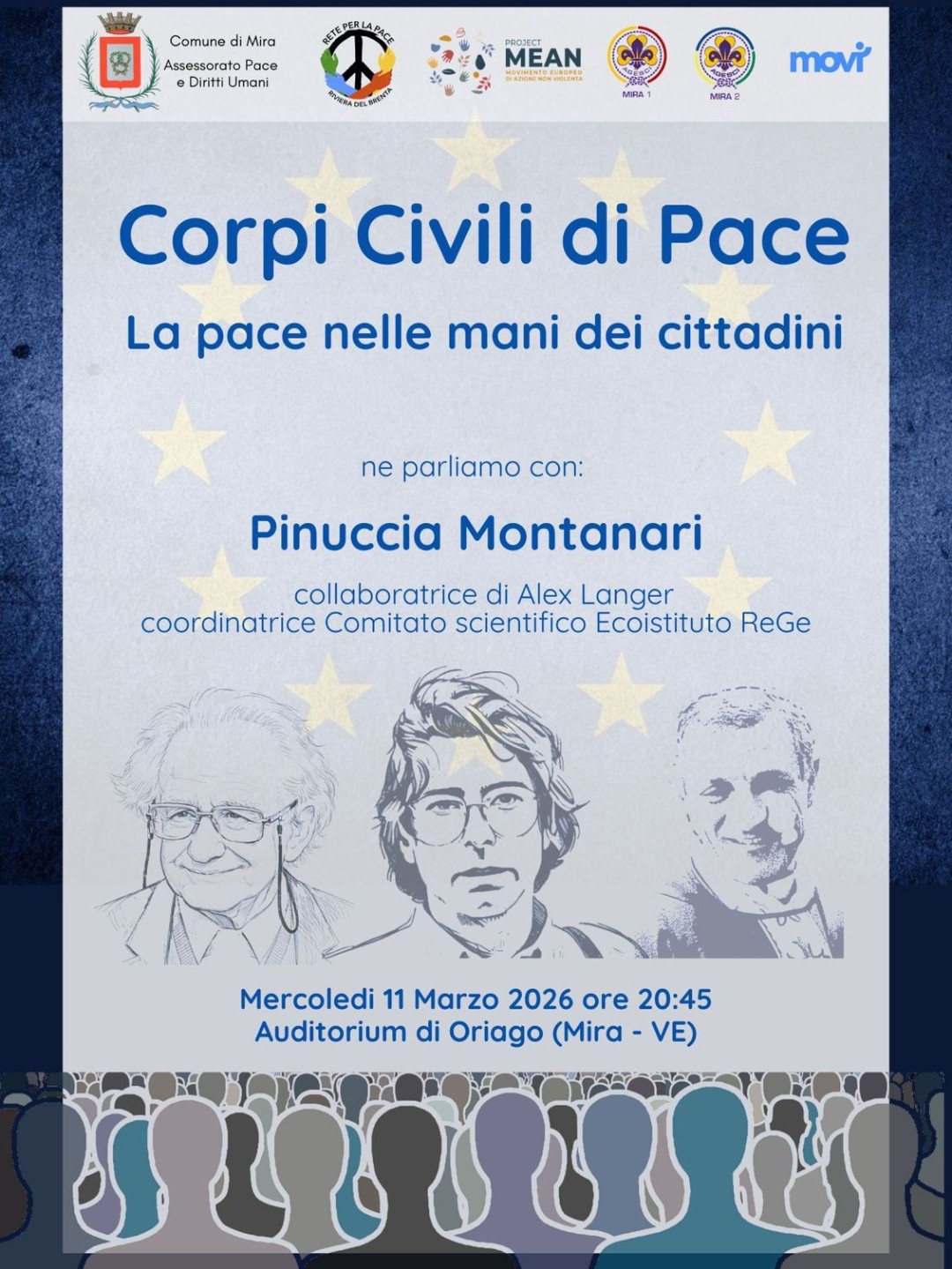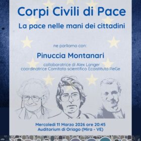 L’iniziativa si terrà mercoledì 11 marzo alle ore 20:45 presso l’Auditorium della Biblioteca Comunale di Oriago (Via Venezia 171/172 Oriago di Mira) e sarà un momento aperto alla comunità per conoscere più da vicino il significato, gli obiettivi e le possibili prospettive legate all’istituzione dei Corpi Civili di Pace, strumenti di intervento non armato e nonviolento nei contesti di conflitto e di tensione sociale. Sarà presente Pinuccia Montanari, già collaboratrice di Alex Langer e coordinatrice del Comitato scientifico dell’Ecoistituto REGE.
