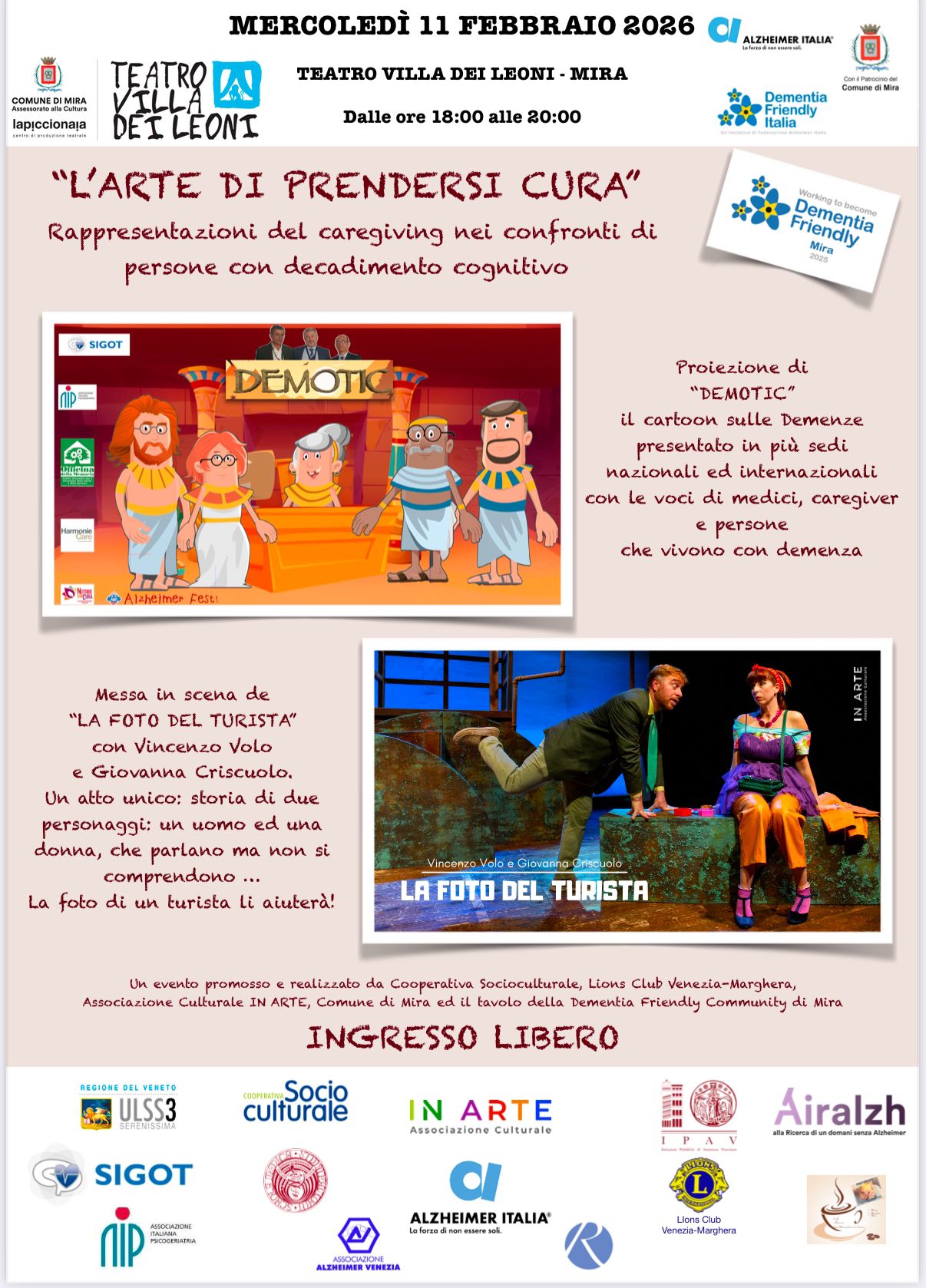 Siamo lieti di invitarvi alla serata  "L'arte di prendersi cura" - rappresentazioni del caregiving nei confronti di persone con decadimento cognitivo"  che si terrà a Mira presso il Teatro di Villa dei Leoni mercoledì 11 febbraio 2026 dalle ore 18.00 alle ore 20.00 un evento culturale dedicato al tema della demenza, attraverso il linguaggio del teatro e del cinema.