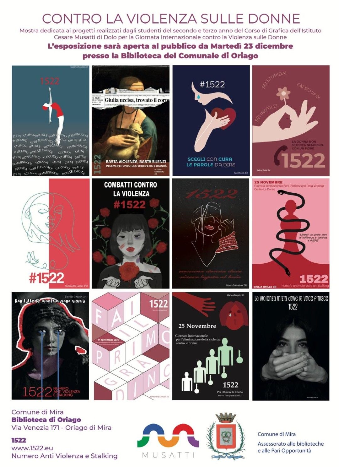 Dal 23 dicembre 2025 è aperta al pubblico presso la Biblioteca Comunale di Oriago (Via Venezia 171, Oriago) un'esposizione di manifesti contro la violenza sulle donne, realizzati dagli studenti dell'Istituto professionale "Cesare Musatti" di Dolo.
