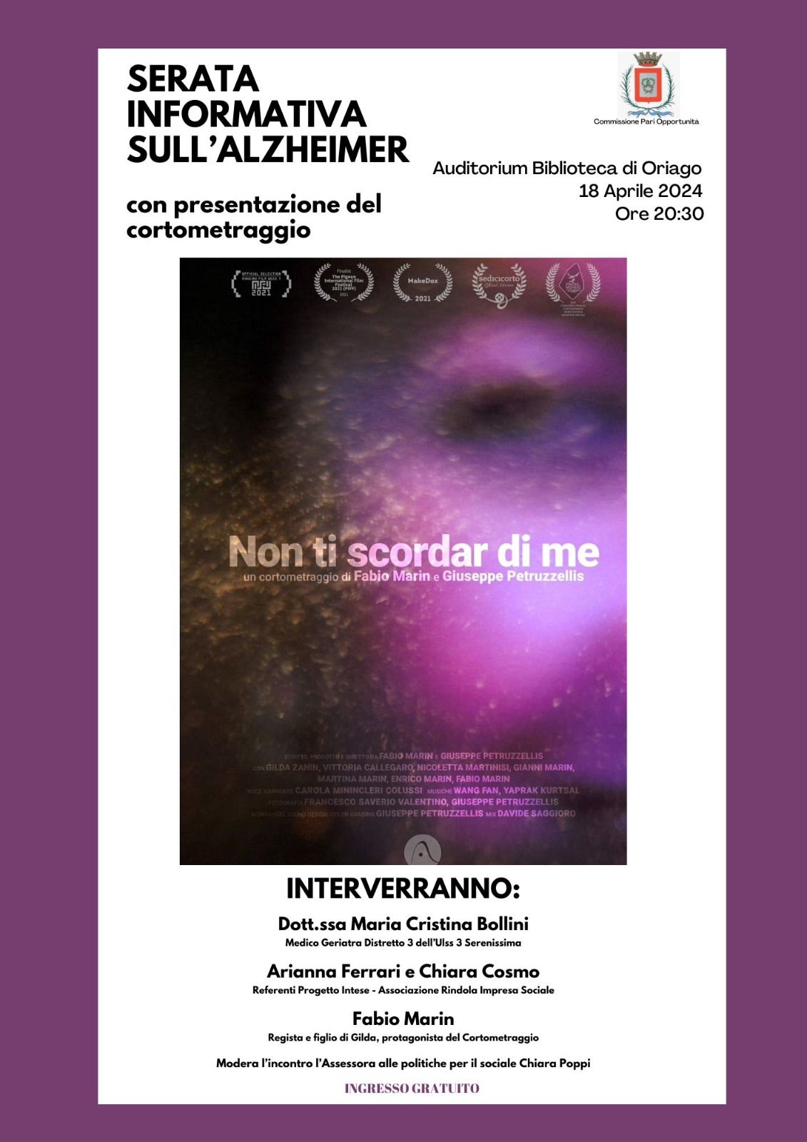A seguire ci sarà la proiezione di un cortometraggio autobiografico sulla storia di Gilda e Fabio Marin, intitolato “Non ti scordar di me”, realizzato a cura dello stesso Fabio, che sarà presente alla serata. L’incontro proseguirà con un momento di discussione e confronto.