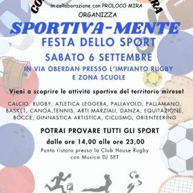 Festa dello Sport, SPORTIVA-MENTE in programma sabato 6 settembre dalle ore 14,00 alle ore 23,00 presso l'impianto da Rugby Riviera e zona scuole di Via Oberdan a Mira.